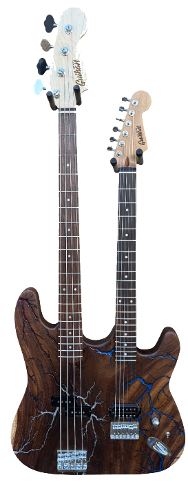 ►BUILT-TO-ORDER: Guihan Fractal Guitars are custom made to order. I will walk you through the process from picking the wood to every option you want for your custom electric guitar and make it one of kind design. It’s not just a guitar, it is Art. ►WOOD: Each live edge guitar body is uniquely hand-crafted and custom designed from weathered-down trees found around metropolitan Phoenix, Arizona. By acquiring these logs, it allows me to create 100% sustainable, re-purposed live edge wood art designs. Locally source and made in North Peoria, Arizona. It takes about 200 hours or more to complete each guitar build. Every guitar build is handmade without the aid of any CNC machine. Both sides of the slab goes to a router sled table to obtain desired flat surface and thickness. As the wood slab ages, noticeable cracks on the wood may appear due to its natural dry cracking process and changes in humidity and temperature. Any voids or cracks from the wood are sealed with epoxy to maintain integrity of the wood. ►BODY: The body is slight heavier due to being desert hardwood. Each body is hand-sanded and shape with minimal power tool use. Since desert hardwood materials are more dense and heavier in weight, the overall thickness between 1-1/2”-1-5/8” to lessen the overall weight of the body. This configuration is only for use with Hardtail fixed bridges. No CNC machine is ever used to shape our guitar bodies. Every guitar body I make starts by harvesting the log myself, put in the sawmill and cut to slabs and shape into a functioning custom made desert hardwood electric guitar with fractal art. Proudly handmade in North Peoria, Arizona. ►NECK: Guihan Fractal Guitars use USA and Japanese made necks for all custom electric guitar builds. The Warmoth brand is available for neck upgrade option. ►PICKUPS: Guihan Fractal Guitars use Seymour Duncan pickups for all custom deluxe and platinum guitar builds. Price changes if you choose to upgrade to Seymour Duncan signature series pickups, Lambertones, EMG, EVH, Lolar pickups or request different pickup brand for your custom Guihan guitar build. ►STRINGS: Guihan Fractal Guitars use SJ-BAL10 Stringjoy Signatures | Balanced Light Gauge (10-48) Nickel Wound Electric Guitar Strings. String Joy strings are expertly crafted in Nashville, TN. ►TUNERS:Gotoh in line 6 tuners are used on deluxe and platinum series guitar necks. ►BRIDGE: Guihan Fractal Guitars use Gotoh, through-body string or top loading mounting hardtail bridge. For tremolo bridge setup, Floyd Rose, Wilkinson/Gotoh VSVG vintage, GFS D01 vintage bridge are available as upgrades. Note*** Tremolo bridge setup will require the body thickness at 1-3/4”. This will make the entire guitar slightly heavier than Fender, Gibson or PRS guitars. ►WIRING HARNESS: The Art Of Tone Gavitt Cloth Wire, 22 Gauge Guitar Wire, Pushback Wire for all custom Guihan Fractal Guitars electric guitars made. USA-Made Excellence: Proudly made in the USA, our 22 AWG wire showcases top-notch craftsmanship and materials, embodying American ingenuity. ►FRACTALART: A process of applying 20,000 volts of electricity to the wood surface recreating a lightning strike in slow motion as well as unique abstract figures, tree and vein like shapes. It is sealed with epoxy inlay ink self-leveling high gloss U.V. resistant formula. *Warning: Don’t try this at home. It is fatal and deadly. ►EPOXYCOLORS: ANGEL WHITE, AQUA MARINE, ARIZONA GOLD, ARMY GREEN, BLACK, CARDINAL METALLIC, CARIBBEAN BLUE, DESERT COPPER, EMERALD METALLIC, GOLDEN YELLOW, GRAY METALLIC, HOT PINK, HUNTER GREEN, ORANGE, PEARL WHITE, PURPLE METALLIC, RED, SKY BLUE, TEAL METALLIC, TURQUOISE BLUE. Other colors are available upon request. ►OILFINISH: Hand rubbed OSMO oil or Old Masters clear satin gel polyurethane and food grade oils to bring out the natural beauty of wooden surfaces.. ►TIMELINE: Guihan Fractal Guitars current timeline for completion is about 3-6 months from the time order is received. Every guitar build is handmade without the aid of any CNC machine. ►PAYMENT TERMS: Guihan Fractal Guitars require 50% deposit down payment non-refundable for all custom build electric guitars. We accept PAYPAL, American Express, Visa, Master Card, Discover, Venmo, CashApp, Zelle, and Apple Pay. ►MISSION STATEMENT: To create a one of kind handmade fractal art electric guitar with patience, care, integrity and passion. Guihan Fractal Guitars is committed to 100% sustainable art. ►THE ARTIST: Garie Chavez has been designing live edge wood and fractal art since 2015. Patience, persistence, passion and attention to detail are the key ingredients to my work. My goal is for my clients to have a piece of art that they cherish, and know that it is truly one of a kind and made especially for them. Thank you for having my art in your home. ►AUTHORIZED DEALER & LUTHIER: Guihan Fractal Guitars is an authorized luthier and dealer for EMG, Lambertones, Seymour Duncan, String Joy, WD Music, Access Bags & Cases, All Parts, Floyd Rose, AP International Music Supply, Pig Hog,