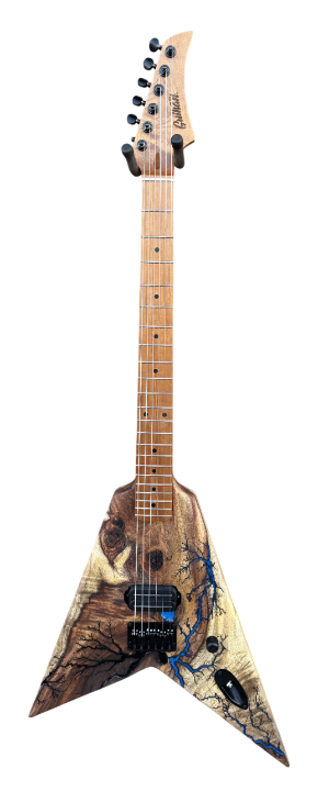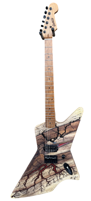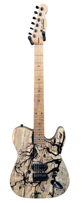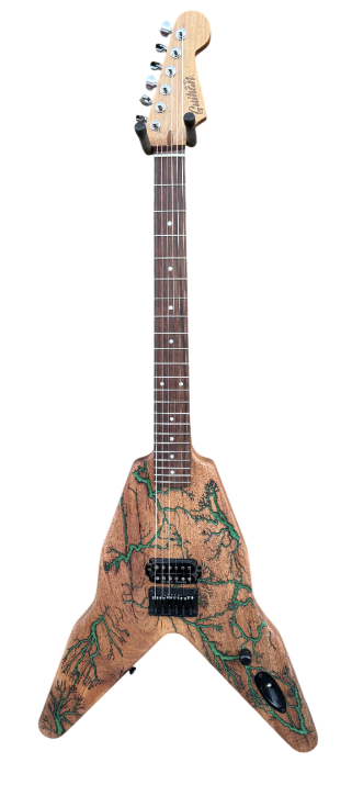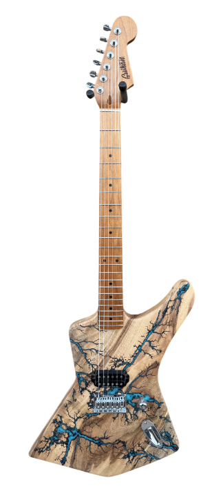 ►BUILT-TO-ORDER: Guihan Fractal Guitars are custom made to order. I will walk you through the process from picking the wood to every option you want for your custom electric guitar and make it one of kind design. It’s not just a guitar, it is Art. ►WOOD: Each live edge guitar body is uniquely hand-crafted and custom designed from weathered-down trees found around metropolitan Phoenix, Arizona. By acquiring these logs, it allows me to create 100% sustainable, re-purposed live edge wood art designs. Locally source and made in North Peoria, Arizona. It takes about 200 hours or more to complete each guitar build. Every guitar build is handmade without the aid of any CNC machine. Both sides of the slab goes to a router sled table to obtain desired flat surface and thickness. As the wood slab ages, noticeable cracks on the wood may appear due to its natural dry cracking process and changes in humidity and temperature. Any voids or cracks from the wood are sealed with epoxy to maintain integrity of the wood. ►BODY: The body is slight heavier due to being desert hardwood. Each body is hand-sanded and shape with minimal power tool use. Since desert hardwood materials are more dense and heavier in weight, the overall thickness between 1-1/2”-1-5/8” to lessen the overall weight of the body. This configuration is only for use with Hardtail fixed bridges. No CNC machine is ever used to shape our guitar bodies. Every guitar body I make starts by harvesting the log myself, put in the sawmill and cut to slabs and shape into a functioning custom made desert hardwood electric guitar with fractal art. Proudly handmade in North Peoria, Arizona. ►NECK: Guihan Fractal Guitars use USA and Japanese made necks for all custom electric guitar builds. The Warmoth brand is available for neck upgrade option. ►PICKUPS: Guihan Fractal Guitars use Seymour Duncan pickups for all custom deluxe and platinum guitar builds. Price changes if you choose to upgrade to Seymour Duncan signature series pickups, Lambertones, EMG, EVH, Lolar pickups or request different pickup brand for your custom Guihan guitar build. ►STRINGS: Guihan Fractal Guitars use SJ-BAL10 Stringjoy Signatures | Balanced Light Gauge (10-48) Nickel Wound Electric Guitar Strings. String Joy strings are expertly crafted in Nashville, TN. ►TUNERS:Gotoh in line 6 tuners are used on deluxe and platinum series guitar necks. ►BRIDGE: Guihan Fractal Guitars use Gotoh, through-body string or top loading mounting hardtail bridge. For tremolo bridge setup, Floyd Rose, Wilkinson/Gotoh VSVG vintage, GFS D01 vintage bridge are available as upgrades. Note*** Tremolo bridge setup will require the body thickness at 1-3/4”. This will make the entire guitar slightly heavier than Fender, Gibson or PRS guitars. ►WIRING HARNESS: The Art Of Tone Gavitt Cloth Wire, 22 Gauge Guitar Wire, Pushback Wire for all custom Guihan Fractal Guitars electric guitars made. USA-Made Excellence: Proudly made in the USA, our 22 AWG wire showcases top-notch craftsmanship and materials, embodying American ingenuity. ►FRACTALART: A process of applying 20,000 volts of electricity to the wood surface recreating a lightning strike in slow motion as well as unique abstract figures, tree and vein like shapes. It is sealed with epoxy inlay ink self-leveling high gloss U.V. resistant formula. *Warning: Don’t try this at home. It is fatal and deadly. ►EPOXYCOLORS: ANGEL WHITE, AQUA MARINE, ARIZONA GOLD, ARMY GREEN, BLACK, CARDINAL METALLIC, CARIBBEAN BLUE, DESERT COPPER, EMERALD METALLIC, GOLDEN YELLOW, GRAY METALLIC, HOT PINK, HUNTER GREEN, ORANGE, PEARL WHITE, PURPLE METALLIC, RED, SKY BLUE, TEAL METALLIC, TURQUOISE BLUE. Other colors are available upon request. ►OILFINISH: Hand rubbed OSMO oil or Old Masters clear satin gel polyurethane and food grade oils to bring out the natural beauty of wooden surfaces.. ►TIMELINE: Guihan Fractal Guitars current timeline for completion is about 3-6 months from the time order is received. Every guitar build is handmade without the aid of any CNC machine. ►PAYMENT TERMS: Guihan Fractal Guitars require 50% deposit down payment non-refundable for all custom build electric guitars. We accept PAYPAL, American Express, Visa, Master Card, Discover, Venmo, CashApp, Zelle, and Apple Pay. ►MISSION STATEMENT: To create a one of kind handmade fractal art electric guitar with patience, care, integrity and passion. Guihan Fractal Guitars is committed to 100% sustainable art. ►THE ARTIST: Garie Chavez has been designing live edge wood and fractal art since 2015. Patience, persistence, passion and attention to detail are the key ingredients to my work. My goal is for my clients to have a piece of art that they cherish, and know that it is truly one of a kind and made especially for them. Thank you for having my art in your home. ►AUTHORIZED DEALER & LUTHIER: Guihan Fractal Guitars is an authorized luthier and dealer for EMG, Lambertones, Seymour Duncan, String Joy, WD Music, Access Bags & Cases, All Parts, Floyd Rose, AP International Music Supply, Pig Hog,
