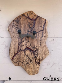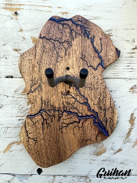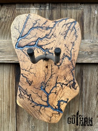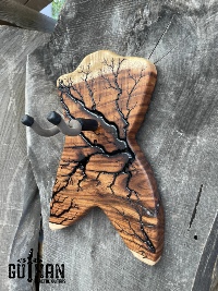 ►INSPIRATION: The creative design behind each guitar hanger is based on the musicians I’ve come to admire throughout my lifetime that made an impact and inspired me to play guitar. It’s my token of appreciation for creating great music of my generation. Keep ROCKING the world! ►DISCLAIMER: Guihan Guitars is not affiliated with, or endorsed, sponsored, or supported by any professional musician artists. The names and images are merely for descriptive purposes only. ►DONATION: Guihan Guitars donate part of the sales of live edge guitar hanger to Alice Cooper Solid Rock. A non-profit organization that has a mission to make a difference in teens’ lives by helping them meet the spiritual, economical, physical and social needs. Thank you for your support. Guihan Guitars donate part of the sales of guitar hanger fractal art to Sweet Relief Musicians Fund. A501-C3 nonprofit charity that provides services and financial assistance for all types of career musicians and music industry professionals. Thank you for your support. ►WOOD: Each live edge guitar hanger is uniquely hand-crafted and custom designed from weathered-down trees found around metropolitan Phoenix, Arizona. By acquiring these logs, it allows me to create 100% sustainable, re-purposed live edge wood art designs. Locally source and made in North Peoria, Arizona. ►FRACTALART: A process of applying 20,000 volts of electricity to the wood surface recreating a lightning strike in slow motion as well as unique abstract figures, tree and vein like shapes. It is sealed with epoxy inlay ink self-leveling high gloss U.V. resistant formula. ►EPOXYCOLORS: Angel White, Aqua Marine, Arizona Gold, Army Green, Black, Blue Metallic, Cardinal Metallic, Caribbean Blue, Desert Copper, Emerald Metallic, Golden Yellow, Gray Metallic, Hot Pink, Hunter Green, Neon Green, Orange Crush, Pearl White, Purple Metallic, Red Metallic, Silver Grey, Teal Metallic, Turquoise Blue. Other colors available upon request. ►OILFINISH: Hand rubbed Old Masters clear satin gel polyurethane and food grade oils to bring out the natural beauty of wooden surfaces. ►GUITARHARDWARE: The new design, known as the “Guitar Keeper”, has a deep cradle design that prevents the guitar from being improperly placed into the hanger. This ultimately provides a safer hanger for your instrument, as the guitar needs to be lifted 2 inches and brought forward to be removed. The pivoting yoke allows for Electric, Acoustic or Bass guitar headstocks to be cradled perfectly while still hanging straight. Made in the USA. ►ENGINEERING: Guihan Guitars researched and tested the use of proper hardware for mounting the String Swing guitar hanger to live edge wood materials. A threaded insert made of carbon steel zinc plated finished goes into predrilled hole and has internal threads. It offers a strong permanent thread to live edge hardwood and mount the guitar hanger yoke. Mounting hardware included with two drywall anchors and two 2-inch Phillips wood screws. ►MOUNTING INSTRUCTIONS: To mount on existing stud walls, drive the screws through pre-drilled pilot holes of hanger into wall using a Phillips screwdriver. If a wall stud is not found, mark the pilot holes on the guitar hanger using a Phillips screwdriver to push and turn the aluminum wall anchor clockwise until flush. Mount the guitar hanger with screws provided through the pilot holes and secure into drywall anchors. Guihan Guitars is not responsible for any damages to the musical instrument for any improper installation of the guitar hanger to the wall.It is the sole responsibility of the owner/buyer to properly install the guitar hanger to the wall. ►DIMENSIONS: Height: 15-16 inches Width: 8-10 inches Thickness: 1-1-1/4 inch ►COMPLETIONTIMELINE: Please allow 2-3 weeks to complete from the time order is received. ►ARTIST / LUTHIER: Garie Chavez has been designing live edge wood and fractal art since 2015. Patience, persistence, passion and attention to detail are the key ingredients to my work. My goal is for my clients to have a piece of art that they cherish, and know that it is truly one of a kind and made especially for them. Thank you for having my art in your home.