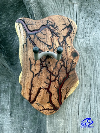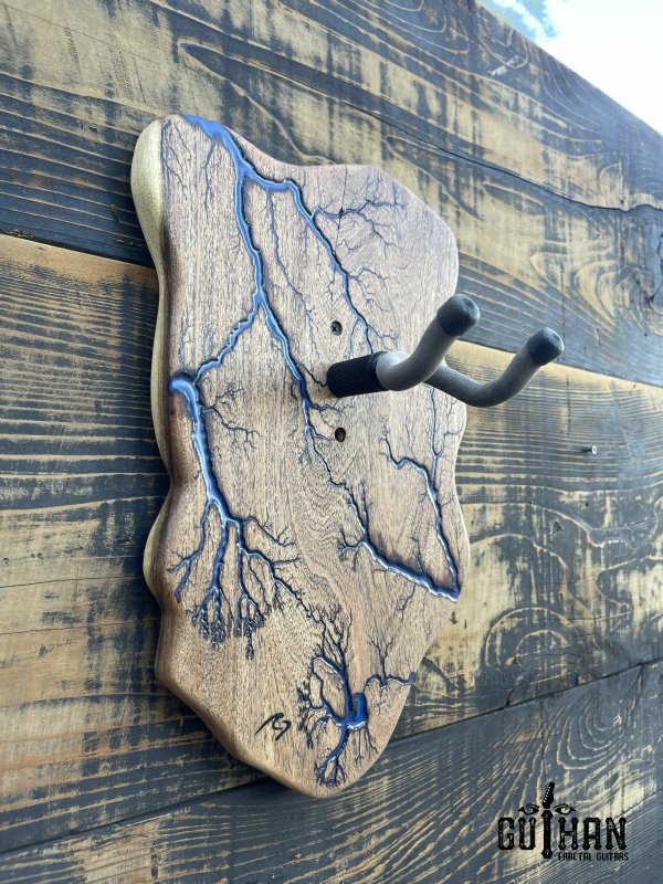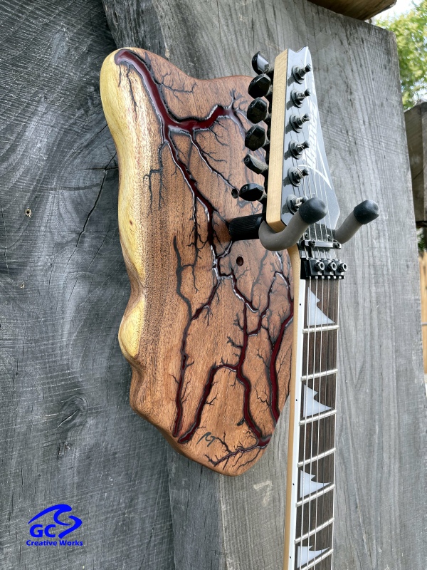 ►INSPIRATION: The creative design behind each guitar hanger is based on the musicians I’ve come to admire throughout my lifetime that made an impact and inspired me to play guitar. It’s my token of appreciation for creating great music of my generation. Keep ROCKING the world! ►DISCLAIMER: Guihan Guitars is not affiliated with, or endorsed, sponsored, or supported by any professional musician artists. The names and images are merely for descriptive purposes only. ►DONATION: Guihan Guitars donate part of the sales of guitar hanger fractal art to Sweet Relief Musicians Fund. A501-C3 nonprofit charity that provides services and financial assistance for all types of career musicians and music industry professionals. Thank you for your support. ►LIVEEDGEWOOD: Each live edge guitar hanger is uniquely hand-crafted and custom designed from weathered-down trees found around metropolitan Phoenix, Arizona. By acquiring these logs, it allows me to create 100% sustainable, re-purposed live edge wood art designs. Locally source and made in North Peoria, Arizona. ►FRACTALART: A process of applying 20,000 volts of electricity to the wood surface recreating a lightning strike in slow motion as well as unique abstract figures, tree and vein like shapes. It is sealed with epoxy inlay ink self-leveling high gloss U.V. resistant formula. ►EPOXYCOLORS: Angel White, Aqua Marine, Arizona Gold, Army Green, Black, Blue Metallic, Cardinal Metallic, Caribbean Blue, Desert Copper, Emerald Metallic, Golden Yellow, Gray Metallic, Hot Pink, Hunter Green, Neon Green, Orange Crush, Pearl White, Purple Metallic, Red Metallic, Silver Grey, Teal Metallic, Turquoise Blue. Other colors available upon request. ►OILFINISH: Hand rubbed Old Masters clear satin gel polyurethane and food grade oils to bring out the natural beauty of wooden surfaces. ►GUITARHARDWARE: The new design, known as the “Guitar Keeper”, has a deep cradle design that prevents the guitar from being improperly placed into the hanger. This ultimately provides a safer hanger for your instrument, as the guitar needs to be lifted 2 inches and brought forward to be removed. The pivoting yoke allows for Electric, Acoustic or Bass guitar headstocks to be cradled perfectly while still hanging straight. Made in the USA. ►ENGINEERING: Guihan Guitars researched and tested the use of proper hardware for mounting the String Swing guitar hanger to live edge wood materials. A threaded insert made of carbon steel zinc plated finished goes into predrilled hole and has internal threads. It offers a strong permanent thread to live edge hardwood and mount the guitar hanger yoke. Mounting hardware included with two drywall anchors and two 2-inch Phillips wood screws. ►MOUNTING INSTRUCTIONS: To mount on existing stud walls, drive the screws through pre-drilled pilot holes of hanger into wall using a Phillips screwdriver. If a wall stud is not found, mark the pilot holes on the guitar hanger using a Phillips screwdriver to push and turn the aluminum wall anchor clockwise until flush. Mount the guitar hanger with screws provided through the pilot holes and secure into drywall anchors. Guihan Guitars is not responsible for any damages to the musical instrument for any improper installation of the guitar hanger to the wall.It is the sole responsibility of the owner/buyer to properly install the guitar hanger to the wall. ►DIMENSIONS: Height: 15-16 inches Width: 8-10 inches Thickness: 1-1-1/4 inch ►COMPLETION: Please allow 5-7 days to complete your celebrity musician custom guitar hanger fractal art from the order is received. ►ARTIST / LUTHIER: Garie Chavez has been designing live edge wood and fractal art since 2015. Patience, persistence, passion and attention to detail are the key ingredients to my work. My goal is for my clients to have a piece of art that they cherish, and know that it is truly one of a kind and made especially for them. Thank you for having my art in your home.