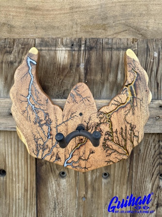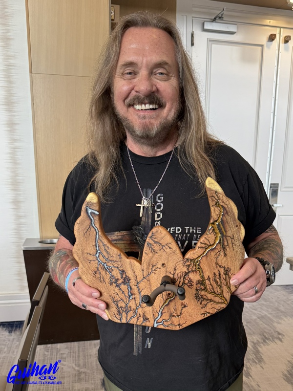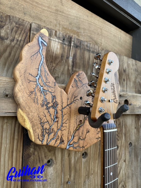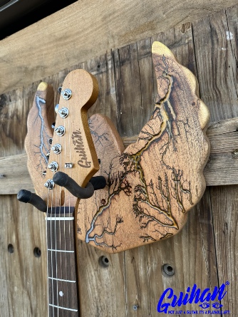 ►INSPIRATION: The creative design behind each guitar hanger is based on the musicians I’ve come to admire throughout my lifetime that made an impact and inspired me to play guitar. It’s my token of appreciation for creating great music of my generation. Keep ROCKING the world! ►DISCLAIMER: Guihan Guitars is not affiliated with, or endorsed, sponsored, or supported by any professional musician artists. The names and images are merely for descriptive purposes only. ►DONATION:Guihan Guitars donate to St. Jude Children’s Research Hospital. A 501-C3 designated nonprofit medical corporation which focuses on children's catastrophic diseases, particularly leukemia and other cancers. Guihan Guitars donate to Sweet Relief Musicians Fund. A501-C3 nonprofit charity that provides services and financial assistance for all types of career musicians and music industry professionals. Thank you for your support. ►LIVEEDGEWOOD: Each live edge guitar hanger is uniquely hand-crafted and custom designed from weathered-down trees found around metropolitan Phoenix, Arizona. By acquiring these logs, it allows me to create 100% sustainable, re-purposed live edge wood art designs. Locally source and made in North Peoria, Arizona. ►FRACTALART: A process of applying 20,000 volts of electricity to the wood surface recreating a lightning strike in slow motion as well as unique abstract figures, tree and vein like shapes. It is sealed with epoxy inlay ink self-leveling high gloss U.V. resistant formula. ►EPOXYCOLORS: Angel White, Aqua Marine, Arizona Gold, Army Green, Black, Blue Metallic, Cardinal Metallic, Caribbean Blue, Desert Copper, Emerald Metallic, Golden Yellow, Gray Metallic, Hot Pink, Hunter Green, Neon Green, Orange Crush, Pearl White, Purple Metallic, Red Metallic, Silver Grey, Teal Metallic, Turquoise Blue. Other colors available upon request. ►OILFINISH: Hand rubbed Old Masters clear satin gel polyurethane and food grade oils to bring out the natural beauty of wooden surfaces. ►GUITARHARDWARE: The new design, known as the “Guitar Keeper”, has a deep cradle design that prevents the guitar from being improperly placed into the hanger. This ultimately provides a safer hanger for your instrument, as the guitar needs to be lifted 2 inches and brought forward to be removed. The pivoting yoke allows for Electric, Acoustic or Bass guitar headstocks to be cradled perfectly while still hanging straight. Made in the USA. ►ENGINEERING: Guihan Guitars researched and tested the use of proper hardware for mounting the String Swing guitar hanger to live edge wood materials. A threaded insert made of carbon steel zinc plated finished goes into predrilled hole and has internal threads. It offers a strong permanent thread to live edge hardwood and mount the guitar hanger yoke. Mounting hardware included with two drywall anchors and two 2-inch Phillips wood screws. ►MOUNTING INSTRUCTIONS: To mount on existing stud walls, drive the screws through pre-drilled pilot holes of hanger into wall using a Phillips screwdriver. If a wall stud is not found, mark the pilot holes on the guitar hanger using a Phillips screwdriver to push and turn the aluminum wall anchor clockwise until flush. Mount the guitar hanger with screws provided through the pilot holes and secure into drywall anchors. Guihan Guitars is not responsible for any damages to the musical instrument for any improper installation of the guitar hanger to the wall.It is the sole responsibility of the owner/buyer to properly install the guitar hanger to the wall. ►DIMENSIONS: Height: 15-16 inches Width: 8-10 inches Thickness: 1-1-1/4 inch ►COMPLETION: Please allow 5-7 days to complete your celebrity musician custom guitar hanger fractal art from the order is received. ►ARTIST / LUTHIER: Garie Chavez has been designing live edge wood and fractal art since 2015. Patience, persistence, passion and attention to detail are the key ingredients to my work. My goal is for my clients to have a piece of art that they cherish, and know that it is truly one of a kind and made especially for them. Thank you for having my art in your home.