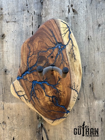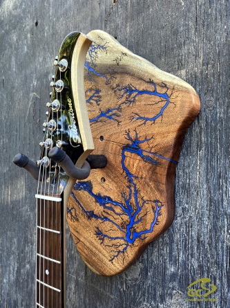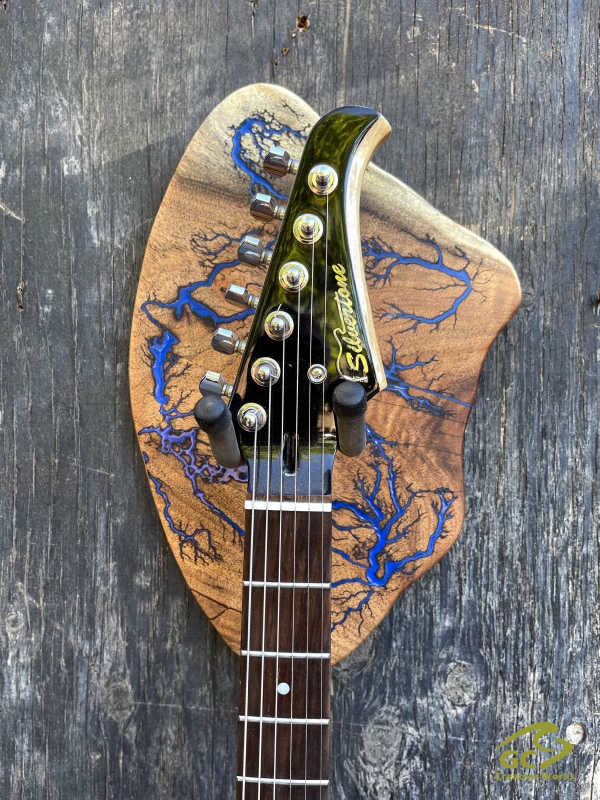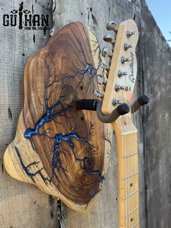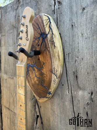 ►INSPIRATION: The creative design behind each guitar hanger is based on the musicians I’ve come to admire throughout my lifetime that made an impact and inspired me to play guitar. It’s my token of appreciation for creating great music of my generation. Keep ROCKING the world! ►DISCLAIMER: Guihan Guitars is not affiliated with, or endorsed, sponsored, or supported by any professional musician artists. The names and images are merely for descriptive purposes only. ►DONATION: Guihan Guitars donate part of the sales of live edge guitar hanger to Alice Cooper Solid Rock. A non-profit organization that has a mission to make a difference in teens’ lives by helping them meet the spiritual, economical, physical and social needs. Thank you for your support. Guihan Guitars donate part of the sales of guitar hanger fractal art to Sweet Relief Musicians Fund. A501-C3 nonprofit charity that provides services and financial assistance for all types of career musicians and music industry professionals. Thank you for your support. ►LIVEEDGEWOOD: Each live edge guitar hanger is uniquely hand-crafted and custom designed from weathered-down trees found around metropolitan Phoenix, Arizona. By acquiring these logs, it allows me to create 100% sustainable, re-purposed live edge wood art designs. Locally source and made in North Peoria, Arizona. ►FRACTALART: A process of applying 20,000 volts of electricity to the wood surface recreating a lightning strike in slow motion as well as unique abstract figures, tree and vein like shapes. It is sealed with epoxy inlay ink self-leveling high gloss U.V. resistant formula. ►EPOXYCOLORS: Angel White, Aqua Marine, Arizona Gold, Army Green, Black, Blue Metallic, Cardinal Metallic, Caribbean Blue, Desert Copper, Emerald Metallic, Golden Yellow, Gray Metallic, Hot Pink, Hunter Green, Neon Green, Orange Crush, Pearl White, Purple Metallic, Red Metallic, Silver Grey, Teal Metallic, Turquoise Blue. Other colors available upon request. ►OILFINISH: Hand rubbed Old Masters clear satin gel polyurethane and food grade oils to bring out the natural beauty of wooden surfaces. ►GUITARHARDWARE: The new design, known as the “Guitar Keeper”, has a deep cradle design that prevents the guitar from being improperly placed into the hanger. This ultimately provides a safer hanger for your instrument, as the guitar needs to be lifted 2 inches and brought forward to be removed. The pivoting yoke allows for Electric, Acoustic or Bass guitar headstocks to be cradled perfectly while still hanging straight. Made in the USA. ►ENGINEERING: Guihan Guitars researched and tested the use of proper hardware for mounting the String Swing guitar hanger to live edge wood materials. A threaded insert made of carbon steel zinc plated finished goes into predrilled hole and has internal threads. It offers a strong permanent thread to live edge hardwood and mount the guitar hanger yoke. Mounting hardware included with two drywall anchors and two 2-inch Phillips wood screws. ►MOUNTING INSTRUCTIONS: To mount on existing stud walls, drive the screws through pre-drilled pilot holes of hanger into wall using a Phillips screwdriver. If a wall stud is not found, mark the pilot holes on the guitar hanger using a Phillips screwdriver to push and turn the aluminum wall anchor clockwise until flush. Mount the guitar hanger with screws provided through the pilot holes and secure into drywall anchors. Guihan Guitars is not responsible for any damages to the musical instrument for any improper installation of the guitar hanger to the wall.It is the sole responsibility of the owner/buyer to properly install the guitar hanger to the wall. ►DIMENSIONS: Height: 15-16 inches Width: 8-10 inches Thickness: 1-1-1/4 inch ►COMPLETIONTIMELINE: Please allow 2-3 weeks to complete from the time order is received. ►ARTIST / LUTHIER: Garie Chavez has been designing live edge wood and fractal art since 2015. Patience, persistence, passion and attention to detail are the key ingredients to my work. My goal is for my clients to have a piece of art that they cherish, and know that it is truly one of a kind and made especially for them. Thank you for having my art in your home.