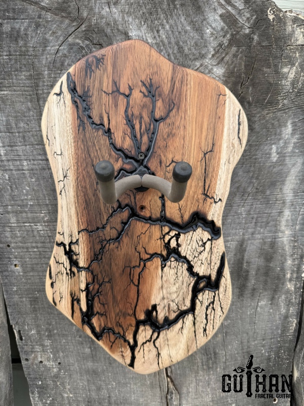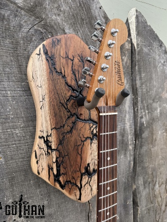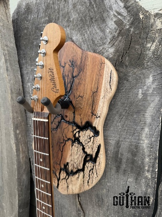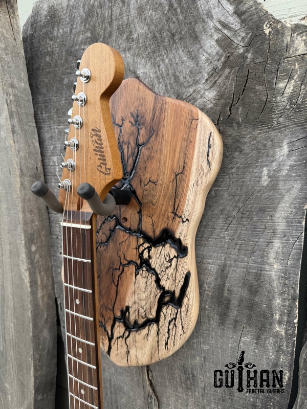 ►INSPIRATION: The creative design behind each guitar hanger is based on the musicians I’ve come to admire throughout my lifetime that made an impact and inspired me to play guitar. It’s my token of appreciation for creating great music of my generation. Keep ROCKING the world! ►DISCLAIMER: Guihan Guitars is not affiliated with, or endorsed, sponsored, or supported by any professional musician artists. The names and images are merely for descriptive purposes only. ►DONATION: Guihan Guitars donate part of the sales of guitar hanger fractal art to Sweet Relief Musicians Fund. A501-C3 nonprofit charity that provides services and financial assistance for all types of career musicians and music industry professionals. Thank you for your support. ►LIVEEDGEWOOD: Each live edge guitar hanger is uniquely hand-crafted and custom designed from weathered-down trees found around metropolitan Phoenix, Arizona. By acquiring these logs, it allows me to create 100% sustainable, re-purposed live edge wood art designs. Locally source and made in North Peoria, Arizona. ►FRACTALART: A process of applying 20,000 volts of electricity to the wood surface recreating a lightning strike in slow motion as well as unique abstract figures, tree and vein like shapes. It is sealed with epoxy inlay ink self-leveling high gloss U.V. resistant formula. ►EPOXYCOLORS: Angel White, Aqua Marine, Arizona Gold, Army Green, Black, Blue Metallic, Cardinal Metallic, Caribbean Blue, Desert Copper, Emerald Metallic, Golden Yellow, Gray Metallic, Hot Pink, Hunter Green, Neon Green, Orange Crush, Pearl White, Purple Metallic, Red Metallic, Silver Grey, Teal Metallic, Turquoise Blue. Other colors available upon request. ►OILFINISH: Hand rubbed Old Masters clear satin gel polyurethane and food grade oils to bring out the natural beauty of wooden surfaces. ►GUITARHARDWARE: The new design, known as the “Guitar Keeper”, has a deep cradle design that prevents the guitar from being improperly placed into the hanger. This ultimately provides a safer hanger for your instrument, as the guitar needs to be lifted 2 inches and brought forward to be removed. The pivoting yoke allows for Electric, Acoustic or Bass guitar headstocks to be cradled perfectly while still hanging straight. Made in the USA. ►ENGINEERING: Guihan Guitars researched and tested the use of proper hardware for mounting the String Swing guitar hanger to live edge wood materials. A threaded insert made of carbon steel zinc plated finished goes into predrilled hole and has internal threads. It offers a strong permanent thread to live edge hardwood and mount the guitar hanger yoke. Mounting hardware included with two drywall anchors and two 2-inch Phillips wood screws. ►MOUNTING INSTRUCTIONS: To mount on existing stud walls, drive the screws through pre-drilled pilot holes of hanger into wall using a Phillips screwdriver. If a wall stud is not found, mark the pilot holes on the guitar hanger using a Phillips screwdriver to push and turn the aluminum wall anchor clockwise until flush. Mount the guitar hanger with screws provided through the pilot holes and secure into drywall anchors. Guihan Guitars is not responsible for any damages to the musical instrument for any improper installation of the guitar hanger to the wall.It is the sole responsibility of the owner/buyer to properly install the guitar hanger to the wall. ►DIMENSIONS: Height: 15-16 inches Width: 8-10 inches Thickness: 1-1-1/4 inch ►COMPLETIONTIMELINE: