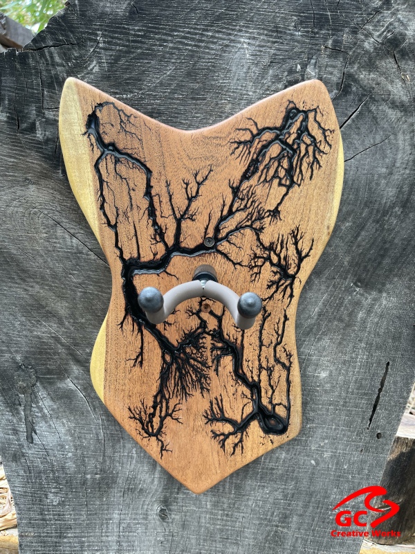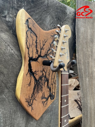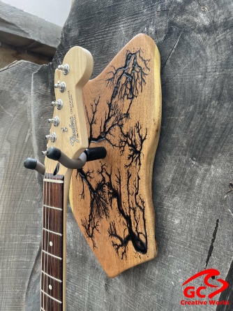 ►INSPIRATION: The creative design behind each guitar hanger is based on the musicians I’ve come to admire throughout my lifetime that made an impact and inspired me to play guitar. It’s my token of appreciation for creating great music of my generation. Keep ROCKING the world! ►DISCLAIMER: Guihan Guitars is not affiliated with, or endorsed, sponsored, or supported by any professional musician artists. The names and images are merely for descriptive purposes only. ►DONATION: Guihan Guitars donate part of the sales of guitar hanger fractal art to Sweet Relief Musicians Fund. A501-C3 nonprofit charity that provides services and financial assistance for all types of career musicians and music industry professionals. Thank you for your support. ►LIVEEDGEWOOD: Each live edge guitar hanger is uniquely hand-crafted and custom designed from weathered-down trees found around metropolitan Phoenix, Arizona. By acquiring these logs, it allows me to create 100% sustainable, re-purposed live edge wood art designs. Locally source and made in North Peoria, Arizona. ►FRACTALART: A process of applying 20,000 volts of electricity to the wood surface recreating a lightning strike in slow motion as well as unique abstract figures, tree and vein like shapes. It is sealed with epoxy inlay ink self-leveling high gloss U.V. resistant formula. ►EPOXYCOLORS: Angel White, Aqua Marine, Arizona Gold, Army Green, Black, Blue Metallic, Cardinal Metallic, Caribbean Blue, Desert Copper, Emerald Metallic, Golden Yellow, Gray Metallic, Hot Pink, Hunter Green, Neon Green, Orange Crush, Pearl White, Purple Metallic, Red Metallic, Silver Grey, Teal Metallic, Turquoise Blue. Other colors available upon request. ►OILFINISH: Hand rubbed Old Masters clear satin gel polyurethane and food grade oils to bring out the natural beauty of wooden surfaces. ►GUITARHARDWARE: The new design, known as the “Guitar Keeper”, has a deep cradle design that prevents the guitar from being improperly placed into the hanger. This ultimately provides a safer hanger for your instrument, as the guitar needs to be lifted 2 inches and brought forward to be removed. The pivoting yoke allows for Electric, Acoustic or Bass guitar headstocks to be cradled perfectly while still hanging straight. Made in the USA. ►ENGINEERING: Guihan Guitars researched and tested the use of proper hardware for mounting the String Swing guitar hanger to live edge wood materials. A threaded insert made of carbon steel zinc plated finished goes into predrilled hole and has internal threads. It offers a strong permanent thread to live edge hardwood and mount the guitar hanger yoke. Mounting hardware included with two drywall anchors and two 2-inch Phillips wood screws. ►MOUNTING INSTRUCTIONS: To mount on existing stud walls, drive the screws through pre-drilled pilot holes of hanger into wall using a Phillips screwdriver. If a wall stud is not found, mark the pilot holes on the guitar hanger using a Phillips screwdriver to push and turn the aluminum wall anchor clockwise until flush. Mount the guitar hanger with screws provided through the pilot holes and secure into drywall anchors. Guihan Guitars is not responsible for any damages to the musical instrument for any improper installation of the guitar hanger to the wall.It is the sole responsibility of the owner/buyer to properly install the guitar hanger to the wall. ►DIMENSIONS: Height: 15-16 inches Width: 8-10 inches Thickness: 1-1-1/4 inch ►COMPLETION: Please allow 5-7 days to complete your celebrity musician custom guitar hanger fractal art from the order is received. ►ARTIST / LUTHIER: Garie Chavez has been designing live edge wood and fractal art since 2015. Patience, persistence, passion and attention to detail are the key ingredients to my work. My goal is for my clients to have a piece of art that they cherish, and know that it is truly one of a kind and made especially for them. Thank you for having my art in your home.